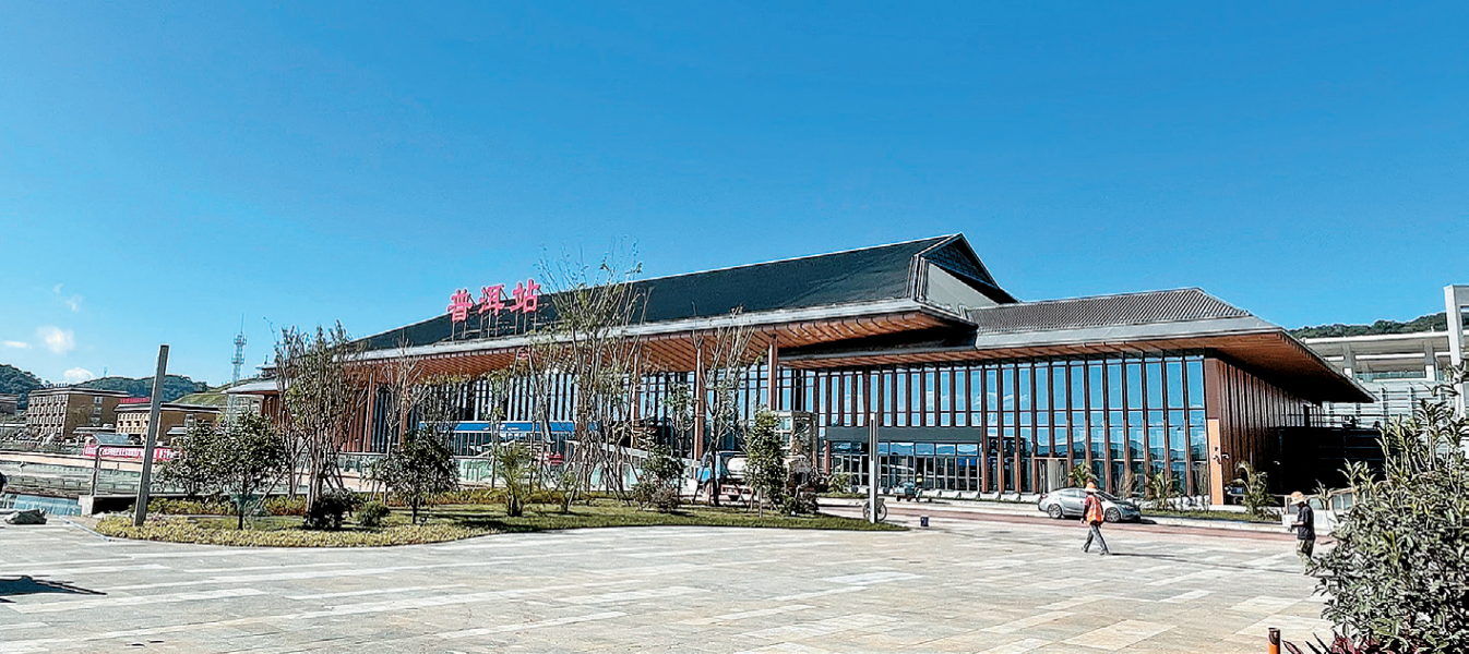 寧洱站設計理念以“多彩茶香、人文寧洱”為主題,整體造型源于對寧洱普洱茶文化的傳統元素發掘提煉,展現出寧洱當地傳統村落特征和源遠流長的茶鄉文化,舒展輕盈的屋頂猶如茶葉盛開,屋檐的延展也使得站房氣質更加靈動;設計源自古普洱府、馬幫驛道等多彩的人文特征。